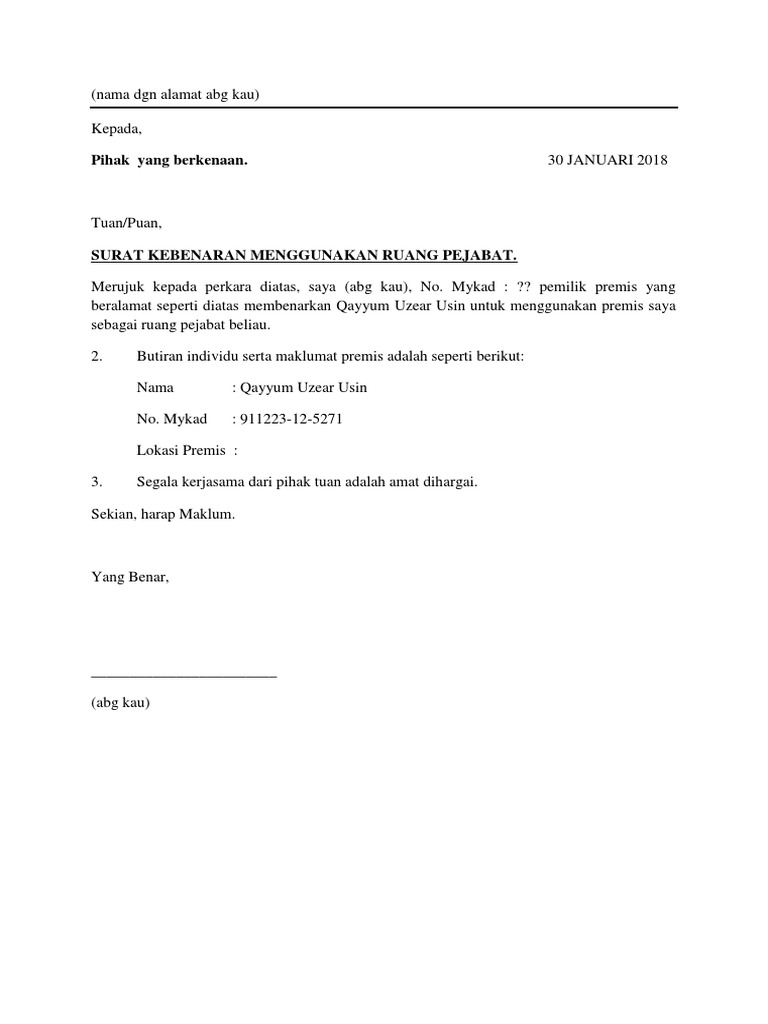 Surat Kebenaran Menggunakan Tanah July 2021 0. Contoh surat kebenaran dari pemilik premis pemilik sama. Merujuk kepada perkara diatas saya abg kau no.
